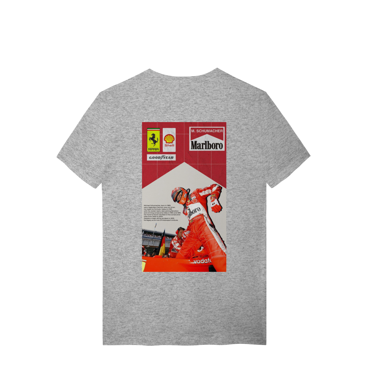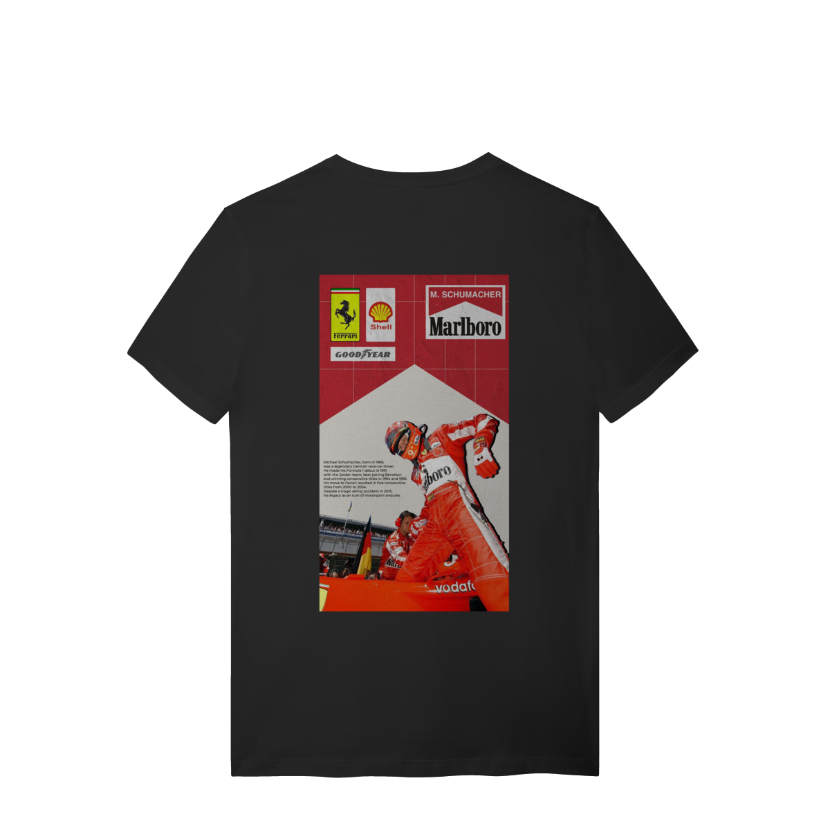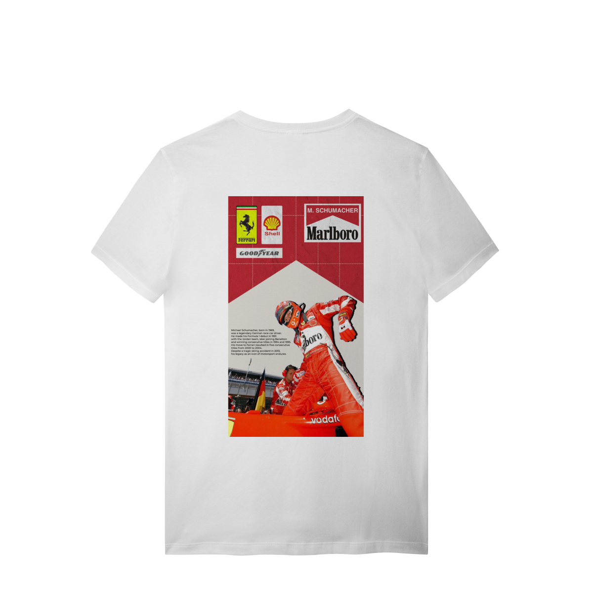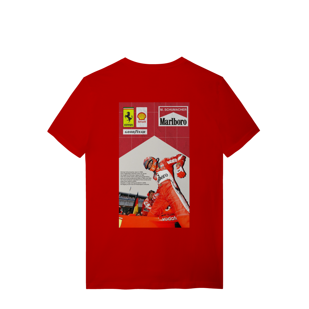 Mais que um piloto, um ícone que redefiniu os limites da velocidade. Esta estampa celebra a era de ouro da Scuderia Ferrari e o domínio absoluto de Michael Schumacher. Dos primeiros passos na Jordan ao pentacampeonato consecutivo que parou o mundo. Vista a história de quem transformou o asfalto em seu império.